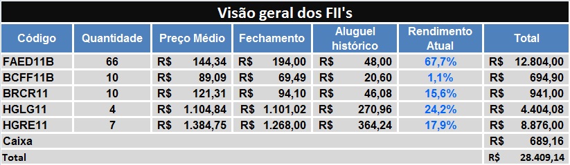 geral dos FII, mostrando o seu código, o preço médio de aquisição, o preço de