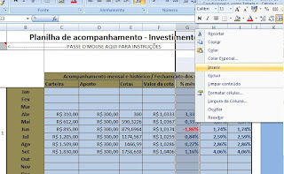 -Abra sua planilha antiga. Clique com o botão direito do mouse exatamente em cima da letra “G” e selecione a opção“Inserir”. Faça este procedimento duas vezes.