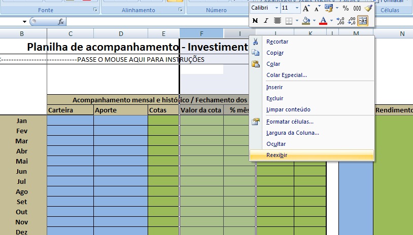 Baixe e abra a nova planilha. Com o botão esquerdo do mouse (o botão normal), selecione as colunas “F” e “I”. Após a seleção, clique com o botão direito exatamente em cima de uma das duas letras e selecione “Reexibir”.