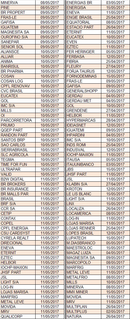 Segue abaixo tabela com previsão de divulgação das demonstrações de 1T17. Para fins de organização, a tabela apresenta as informações em ordem cronológica e em ordem alfabética das empresas.
